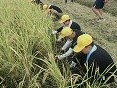 自分たちが植えた苗が半年でこんなに生長し稲が実ることに大変驚いていました。鎌を使って一株一株丁寧に刈り取りました。脱穀も見学しました。収穫したお米を使用して家庭科で調理実習を行う予定です。
