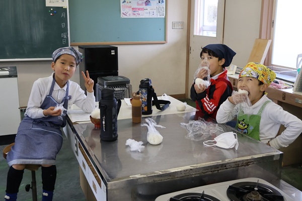 田んぼの先生である松下富男先生をお招きし、1年間お世話になって収穫したお米を使って、おにぎりを作りました。全校児童や先生にも配り、そのおいしさを皆で分け合い、あらためて感謝の気持ちが芽生えました。