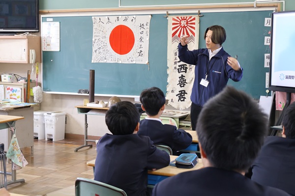甲賀市公共交通推進課より野口功貴主事をお招きし、バスや電車はみんなの乗り物で、だれもが使える乗り物のことを公共交通といい、バスや電車には、つり革や手すり、優先座席があることなどを学びました。
