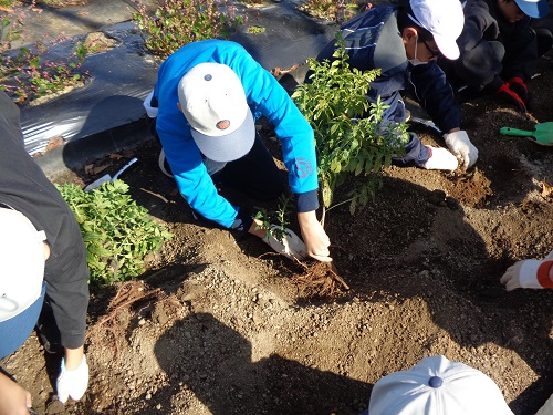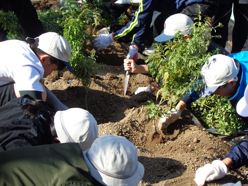 6年生はムラサキを栽培し、紫根染めをした布を使って、家庭科の「お世話になった人へのプレゼント」として小物づくりをします。このように、エコパークの薬草は子どもたちの学習におおいに役立っています。