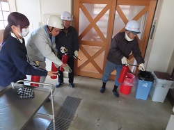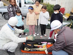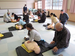 災害が起こった際には地域との連携が大切です。そこで、今年度は合同避難訓練を実施しました。まずは、火災想定による避難。いつもなら中庭に1次避難をして終わりですが、コミュニティセンターへの2次避難までを行いました。その間に、地域の方が初期消火をいっしょにしてくださいました。次に、防災倉庫を見せていただきました。たくさんの避難グッズを見て、自分たちの日ごろの備えについても考える機会となりました。最後は、心肺蘇生法やAEDの訓練です。地域の方にもついていただきながら体験しました。地域の皆様、ありがとうございました。