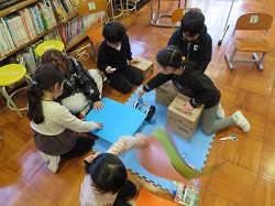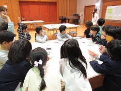 小原小に3校で集まりました。3校時は、「猛獣狩りへ行こうよ」や「9マスおにごっこ」などで仲よく過ごし、4校時は、図画工作科のアートカードを使ってお互いの感じ方の違いを楽しみました。最後は全員で給食をいただきました。1学期にいっしょに行った社会見学の話などもしていて、どんどん仲よくなっているのを感じました。
