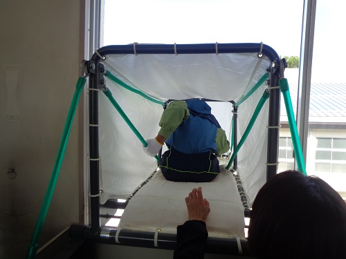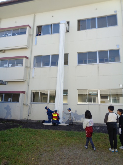 救助袋を使って避難する訓練を行いました。