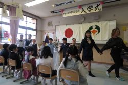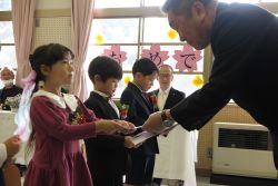 今年度は、なんと20年ぶりに5名の新入生を迎えました。ようこそ多羅尾小学校へ。多羅尾区からのお祝いを一人ずつにいただき、2年生から6年生の歌とダンスで歓迎しました。姿勢よくお話を聞き、返事やお礼もしっかりと言えた1年生でした。転入生も含め、14名でのにぎやかなスタートです!
