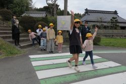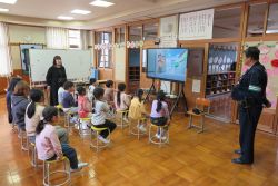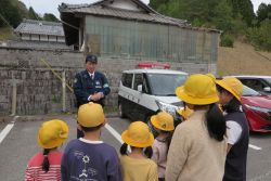 4月からお世話になる多羅尾駐在所の岩井田さんに来ていただき、全校で交通安全教室を行いました。バス停は近くなりましたが、人数も道路を横断することも増えたため、実際に通学路を歩きながら、道路の歩き方・渡り方を丁寧に教えていただきました。また、自転車に乗るときは必ずヘルメットをかぶることなども確認しました。