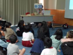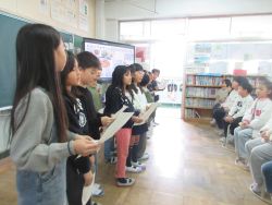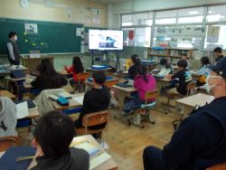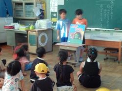 大型絵本やタブレットをうまく使って、図書委員のみんなが絵本を読んでくれました。その後、絵本にかかわるクイズにも挑戦しました。