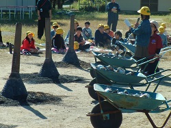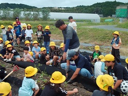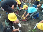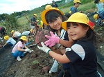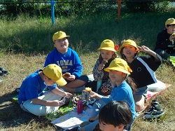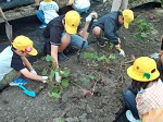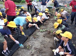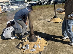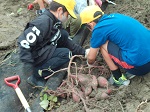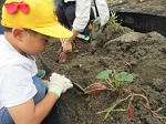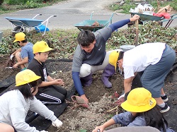 学校園で大きく育ったさつまいもを、色のみんなで力を合わせて掘り起こしました。苗植えでもお世話になった増田さんと福永さんに、掘り方のコツを教えていただきました。